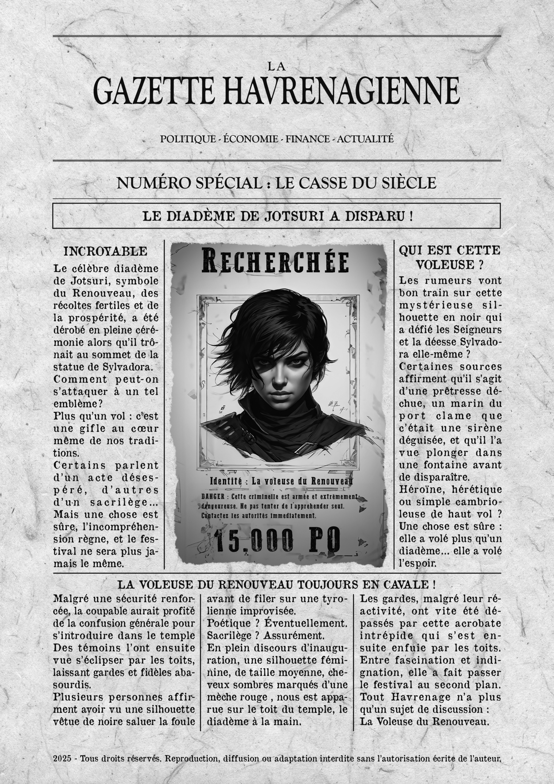 Bienvenue dans la Gazette de Havrenage, bien plus qu’un simple journal : une porte ouverte sur les secrets et les intrigues de la cité la plus vibrante et énigmatique de Célestis. Chaque numéro enrichit l’univers de mes romans, dévoilant des facettes inédites, des mystères cachés, et des détails que même les livres ne peuvent contenir.